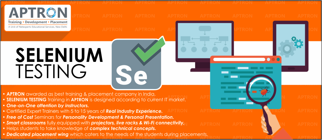 APTRON gives real-time and placement centered Selenium training in Noida. Our Selenium course incorporates basic to advanced level and our Selenium course is designed to get the placement in great MNC companies in Noida as fast as once you complete the Selenium placement training course. Our Selenium trainers are Selenium certified specialists and experienced working experts with hands-on real-time different Selenium projects information. We have designed our Selenium course substance and prospectus dependent on understudies prerequisite to accomplishing everybody's career objective. In our Selenium training program, you can adopt either functional or technical Selenium modules, Selenium real-time project, and Selenium certification placement training.